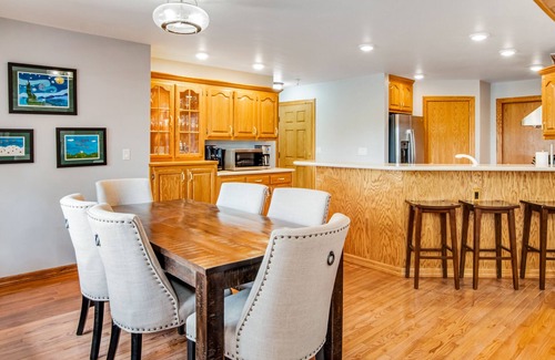 As you enter this air-conditioned lake home, you will discover an ample and bright open floor plan with vaulted ceilings, wooden accents throughout, and plenty of space to unwind and create everlasting memories with your loved ones. A welcoming living area invites you to relax and spend a tranquil time streaming your favorite series and movies on the smart TV or you can break out any of the board games provided for an entertaining time with your friends. If you are visiting during the winter months, the gas fireplace will keep you nice and toasty in the blink of an eye. Prepare tasty treats and homemade meals for the group in the well-appointed kitchen, complete with all the essentials, including stainless steel appliances, a walk-in pantry, and a Krups coffee maker. Dine indoors at the adjoining dining area or outdoors with the lake as your backdrop. The deck offers a nice outdoor dining area with two tables and a convenient gas grill should you want to host summertime cookouts.