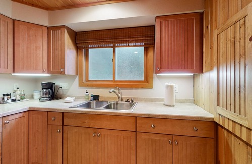 At home, start the day with coffee out on your patio or furnished deck and wake up with the lake. For meal prep, the cottage offers a well-equipped, open kitchen, while the main house features a full kitchen with stainless steel appliances to make meal prep a breeze. Over in the cottage, dining can be enjoyed indoors at the breakfast bar or the table for six, while the rustic table for four in the main house stands ready for meals or family game nights. Homey, traditional furnishings and open layouts adorned with golden, knotty wood features make it easy to get comfortable with friends and family in both homes.