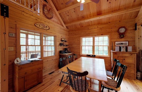 No matter the time of year, this log cabin welcomes you and your loved ones for a getaway. Enjoy gorgeous views of Wilson Pond, easy access to the beach and snowboarding trails, and a peaceful, convenient location.