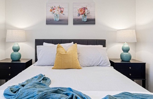 • Bdrm #1 Main Floor Master en suite w/ KING Bed, nightstands and lamps on both sides of the bed, smart TV with Live/YouTube TV access, large dresser, and large closet with 2x luggage racks and ample hangers. Master bathroom features a walk-in shower, single sink vanity, & toilet.