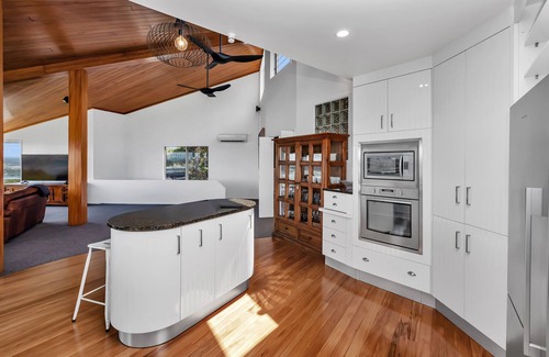 As shown in the photos the property has unfenced access to bordering reserve land, which is great for native birdsong. Absolutely no pets allowed, and guests should take personal responsibility for the safety of their group in and around the bush. It is in a very quiet area, please respect the neighbours and drive carefully at night to avoid Kiwi crossing.There is a spa at this property that is not available for guest use. The king sized bed in bedroom two can be split to make two single beds. Please note it is Super-king sized if bringing your own linen, and please inform us at the time of booking which configuration you require. The property is on a hill with a view, and though the driveway is steep, it is wide with a good concrete surface and has a turning bay at the entrance to the property.Guests should bring their own Nespresso compatible pods to make use of the available machine. Please note a bond may be charged at certain times of the year. One of our team members will contact you if this is required for your booking.
