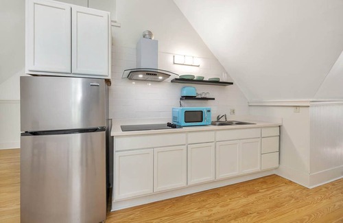 This house has three separate apartments inside. The top floor is the cutest studio apartment perfect for solo travelers including all new kitchen appliances and all essentials like (Kitchenware, Bath-ware, Linens), Stovetop, Microwave and Full-Size Fridge.