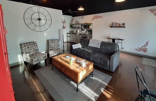 In this upscale modern style apartment you will have the entire studio to yourself. It is an open concept apartment fully furnished with efficiency kitchen, queen bed with full closet for storage and hanging clothing. The bathroom is split with a antique claw foot tub and separate shower and antique dressing table for quiet relaxation. The sink and toilet are across the hall for additional privacy. A stacked washer and dryer are included with detergents provided in room to make longer stays more comfortable. All lines and towels are provided as well as an assortment of Keurig coffees and hot teas. Fresh muffins are in your welcome basket upon check in.