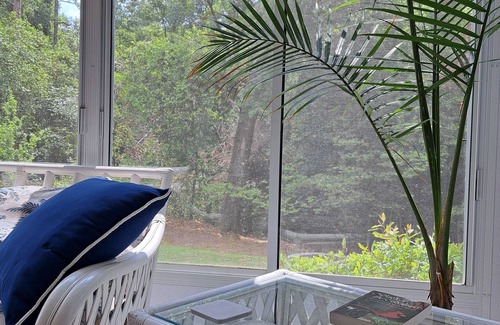 Comfy vintage home with 3 bedrooms. Bedroom 1 has a queen bed and attached half bath. Bedroom 2 features a queen bed and Bedroom 3 has 2 twin beds. The twin room can also be utilized as a workspace as it has a small desk. There is a cozy living room with a recliner couch and a loveseat. A dining area as well as a small bar counter flows into a conversation area near the back door which leads to the sunny enclosed back porch. This area maintains a comfortable temperature fall through spring and cooler summer mornings and evenings. The area behind the house is private woods so you can sit and enjoy watching birds, squirrels and the occasional deer. The laundry is immediately outside of the kitchen door in the garage. If you need to use the garage for small vehicles such as bikes, motorcycles, kayaks or a golf cart please arrange it with us ahead of time. Maximum capacity of 6 (4 most comfortable) no parties or events. Security cameras are at the front door and driveway, parking for 3-4 vehicles. No pets or smoking allowed. Check in after 3pm and check out is 11am.
