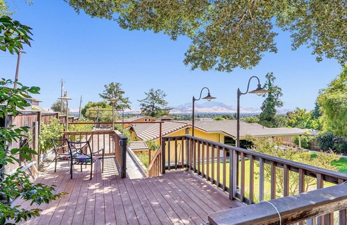 You will enjoy a beautiful lush green yard, fruit trees, private parking, a bocce court, covered patio, commercial BBQ, patio area, fire pit and a pool. The gorgeous full size chef's kitchen will satisfy any gourmet chef with gas cooktop, quartz countertops, drawer microwave, 2 warming ovens, island, farm sink, full size refrigerator and dishwasher. There is a dramatic and unique glass industrial garage door in the kitchen that opens to a lovely covered patio and bbq area. Property is 1200 sq feet, single story with 2 bedrooms and 2 full baths. There are dining areas in the kitchen and outside. There are 2 full bathrooms, one with a Jetted tub and separate shower and one with a rainhead shower. There is a third room that has a queen sofa bed in it and therefore can also be used for sleeping, but it is marketed as a TV room or office, not a full time third bedroom. There is a Miele washer and dryer located in the bathroom. Home is located on a private road with a park in front of the property with full access to canal trail for biking, jogging or just walking the dog. There is a 42' long pool, a regulation bocce court, and large yard. Perfect for family visiting from out of state or out of country or for a flex-cation. Home is 27 miles to San Francisco and 36 miles to Napa Wine Country. There is also a fire pit area, perfect for sitting and watching the moon rise while roasting marshmallows or enjoying a glass of wine. 3rd room has a sofa bed queen sleeper and can be used as TV/office/family/bedroom. We don't recommend you use it as a full time bedroom.