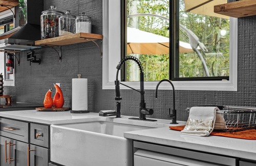 The kitchen is as stylish as it is functional, with a deep purple accent wall, modern black cabinetry, and cedar open shelving that makes the space truly stand out. A large island with bar seating provides the perfect gathering spot, while stainless steel appliances and a farmhouse sink add convenience and flair.