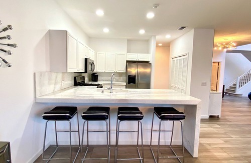 Stunning home located inside the prestigious Ibis Golf & Country Club. The home is updated with modern porcelain wood-style plank floors, stainless steel appliances in the kitchen, and washer and dryer in the laundry room. This home is fully furnished and stocked with everything you need to enjoy an upscale relaxed country club experience during your visit.