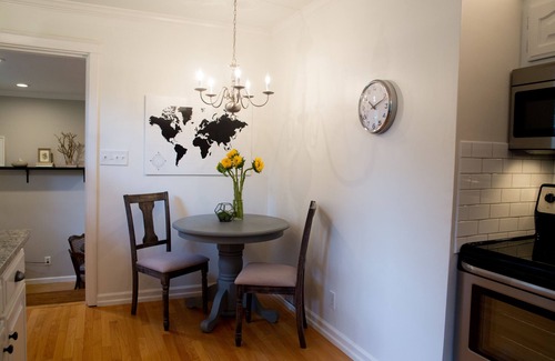 The kitchen has been newly renovated and features all brand new, stainless steel appliances and granite countertops. The kitchen is a full-functioning space and includes any cooking tools you may need, as well as a large set of dinnerware (and kids' dinnerware too!). Enjoy your morning coffee at our breakfast nook or spread out for a meal at our large dining room table.