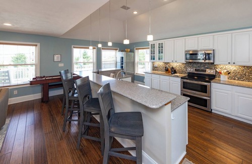 Inside, find three levels of living space. Host family gatherings in the large kitchen, the separate dining room, and the spacious great room, complete with a classic shuffleboard table. Sit down to eat in the dining room or dine al fresco. Enjoy gorgeous wood floors, leather sofas, a satellite radio system with speakers throughout the house, free WiFi, and two primary bedroom suites with king beds (including one with a jetted bathtub).