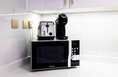 The dining area features a dining table and chairs to accommodate up to 6 persons, where you’ll devour your home-cooked meals. The kitchen is fully equipped with essential kitchen appliances featuring a microwave, a toaster, and a coffee machine for your convenience.
