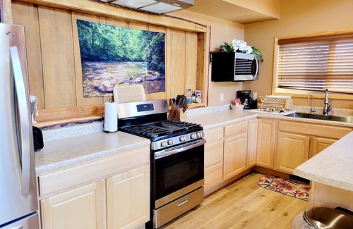 The upstairs portion offers a loft style bedroom with a king canopy bed, as well as a sleeper sofa in the living room with a wood burning fireplace. Lots of big windows so you can see the beautiful mountain views from every angle of the living room and kitchen!