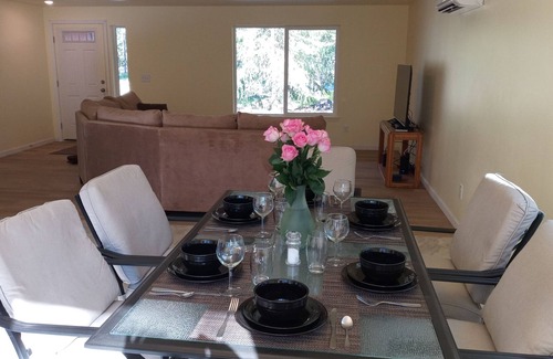 Snuggle in on ample couches with a TV and DVD player. Amenities include a full kitchen with granite countertops, dining room table for 6 guests, raised bar with bar stools, washer/dryer, and vinyl plank flooring throughout. The three bedrooms contain queen-size beds, and a twin AeroBed inflatable bed can be added to the Master bedroom for a 7th guest, or for those who prefer to sleep solo.