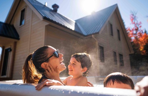 The chalet offers a Spa and 4 bedrooms, all equipped with queen beds, 3 full bathrooms, comfortably accommodating 10 people. The bright lower level has a living room and a game room with a pool table. Outside, you'll find a large 4-season Spa for 8 people, a fire pit area with Adirondack chairs, and access to the wooded area. A breathtaking view also awaits you just a few minutes' walk away at the Domaine's lookout.