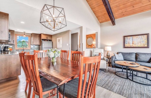 The entry has a bench and cubbies for storage of your gear. A half flight of stairs up brings you to the living room, which features vaulted ceilings and large windows that fill the space with natural light. Relax in comfort with inviting furniture, a cozy fireplace, and a large HDTV. Be sure to step onto the deck, where the fresh mountain air really complements the stunning views. In the kitchen you'll find fingerprint-less appliances, granite countertops, and beautiful wood cabinets. It is fully equipped and the open layout provides added convenience. The dining room table accommodates six, and the lovely chandelier offers ample lighting.