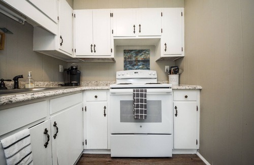 This eclectic apartment has a comfy sofa and chaise lounge in the living room that can fold down for additional sleeping There is a 40" ROKU TV and WIFI. No cable. The beautiful bedroom has a queen size bed with new mattress, chest of drawers and a door to the back patio. The bathroom just off the bedroom has a cozy farmhouse vibe and is fully stocked with towels and toiletries. You'll have all you need to cook in the updated kitchen and enjoy your food in the cute breakfast nook.