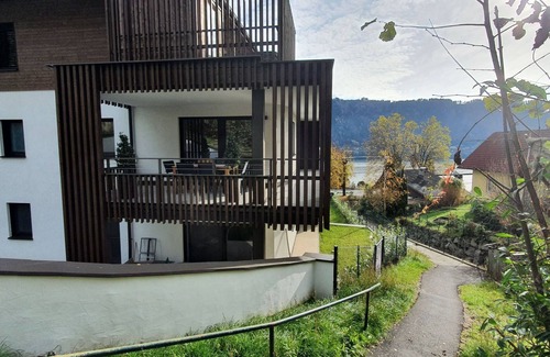 "Edelbach Deluxe 1", 3-room apartment 75 m2 on 2nd floor. Modern and cosy furnishings: living/sleeping room with 1 sofabed (160 cm, length 200 cm), TV (flat screen). 1 room with 2 beds (90 cm, length 200 cm). 1 double bedroom with 1 double bed (180 cm, length 210 cm). Open kitchen (oven, dishwasher, 4 ceramic glass hob hotplates, toaster, kettle, microwave, electric coffee machine) with dining table. Sep. WC, bath/shower/WC. Heating. Balcony. Balcony furniture. Side view of the lake. Facilities: children's high chair, baby cot. Internet (WiFi, free). Please note: non-smokers only. Smoke alarm.