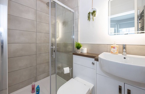 The bathroom boasts a powerful, refreshing rainfall shower. High ceilings and clever design create a bright, airy space that feels both spacious and cosy.