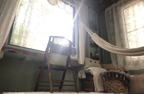 This 90 square-foot habitat is what whimsical tiny-living dreams are made of! Nestled between the trees, this retreat for two, under a tin roof adorned with wrought iron, twinkle lights, and dried flower bouquets, is sure to be the ideal “home away from home" for any nature lover! An excellent glamping environment for rest, reconnection, and romance!