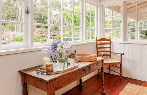 Tucked away on three acres, this home has lots of warmth and charm. It’s as pretty as a picture with its cottage gardens, white-painted window frames, wooden floorboards, and large farmhouse dining area that is superbly equipped for entertaining.