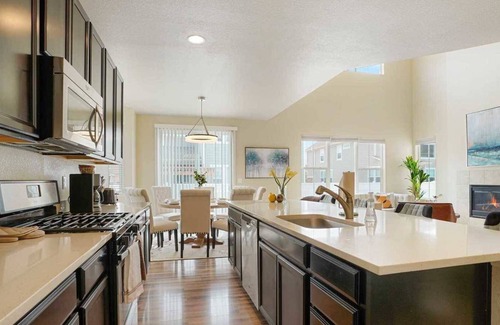 This modern, chic house in Longmont is the perfect home away from home. Features 4 bedrooms, 2.5 bathrooms, and a gorgeous gourmet kitchen with stainless steel appliances and an island. You can enjoy the delicious food made by hand with your family here. The house has a large enough office area, perfect for those of you who need to work from home. With matching furniture designed by professional designers, the living room has a fireplace for viewing and heating. Enjoy the snow season while you stay in this luxurious home.