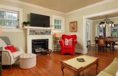 As soon as you arrive you'll immediately notice the large front porch, beautifully decorated and perfect for sipping morning coffee or watching friendly neighbors walk throughout the lively neighborhood. Upon entering the home you will step into the living room with comfortable seating, TV (cable not included, however you can log into your own streaming accounts), and classic french doors that open to the spacious dining room. In the dining room you'll find a gorgeous wooden table with space for 4. You'll love the natural light in this space! Next you'll find a fully stocked kitchen with stainless appliances and all the supplies you need to craft delicious meals together. Towards the back of the kitchen you'll find the back door, which opens to a private garden/patio area with space for relaxing in the evenings.