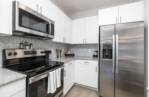 Relax in the expansive living area, furnished with a generous 65-inch flat-screen TV, or settle in for some productive time at the serene and well-appointed workstation. The bedroom offers a cozy retreat, featuring a plush bed for your utmost comfort and an additional TV for your entertainment needs. Thanks to its open layout, the space is filled with natural light, creating an inviting atmosphere that's perfect for unwinding and recharging. Reserve your stay now and immerse yourself in the epitome of contemporary living!!