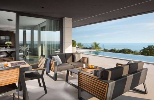 This elegant villa in Rabac, Istria is perfect for large families or groups. It features a private indoor pool, a covered terrace for morning coffee, and a peaceful garden for outdoor meals and relaxation. Inside, guests can unwind in the sauna or stay active with fitness equipment, ideal for recharging after a day at the beach. The sea is just 1 km away, while restaurants and a supermarket are 14 km from the property. The villa includes both indoor and outdoor kitchens, perfect for preparing meals to enjoy with loved ones. A wireless music system and streaming service ensure entertainment throughout your stay. Free on-site parking keeps your vehicle secure. Whether you're swimming, grilling, or relaxing indoors, this villa offers a perfect blend of comfort, wellness, and coastal charm for a memorable Istrian escape.