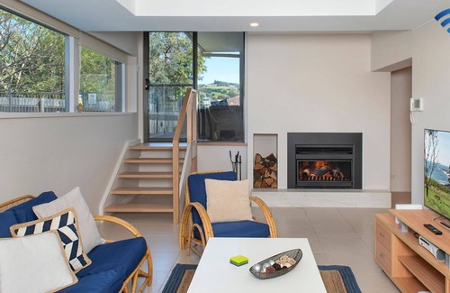 The bedrooms are all upstairs and there is another large family room with TV - a great place to separate the young from the old or the noisy guests from those wanting peace and quiet. A study nook with desk and WiFi also allows those who need to stay in touch. With four generous sized bedrooms and three bathrooms, accommodating the extended family will be easy. The master bedroom has the best views and its own TV and ensuite to retreat to. Enjoy amazing sunrises over the ocean from the upstairs balcony and watch for passing whales in season.