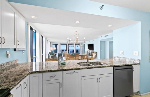 Emerald Towers 1101 offers three bedrooms and three baths, comfortably accommodating up to eight guests. The calming shades of sky blue throughout create a serene atmosphere, and the open-concept living and dining area is decorated with cozy furnishings, offering sweeping Gulf views. Open the floor-to-ceiling sliding glass doors to let in the ocean breeze while relaxing on the sofa. The generous kitchen provides ample cabinet and counter space and is fully equipped for meal prep. The private balcony is the perfect spot for enjoying a sunset while the kids sort through their seashells. The master suite features a king-sized bed, en suite bath, and private balcony access, while the guest suites include a king-sized bed and a queen bed with twin bunks. Flat-screen TVs in every room and a full-sized washer and dryer add extra convenience.