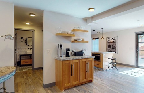 You'll love this industrial modern 1 BR apartment sleeps 2-4. With a loft-style large open floor plan, huge chef's kitchen with massive island and counter seating for 8 there’s plenty of room to spread out and relax. The cushy living room space has a large screen TV and leather sectional. The cook's kitchen has a granite island which seats 8, all high-end KitchenAide appliances and laundry in unit.