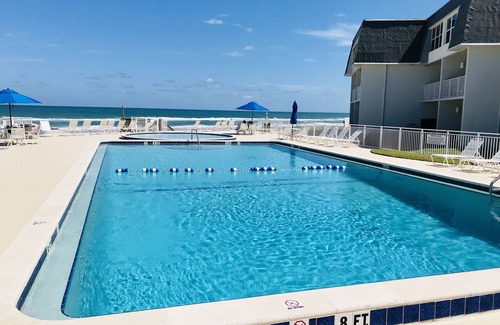 Exceptionally clean and recently renovated Surfside Condo. This beautiful beachfront condo in New Smyrna Beach is on the NO DRIVE PART OF THE BEACH, so it is much safer and quieter for kids and families. This spacious condo is a 2 bedroom 2 bath and sleeps 6 comfortably. Includes a large heated pool, kitty pool, sun deck, and sitting areas. This condo comes fully furnished, with an updated kitchen. Beach chairs, umbrella and clean beach towels included. Perfect rental for families. Sorry, no pets. Feel free to message with any questions!
