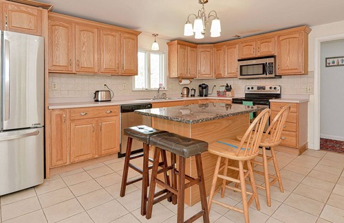 The house has a spacious kitchen for those who prefer to cook their meals, and a large dining room for family meals. Connected to the dining room is the living room with its granite fireplace and slate floors. Sliding doors open from the living room onto the verdant backyard, which offers a surprising amount of privacy. Sit on the deck to catch the ocean breezes or frolic in the in-ground swimming pool.