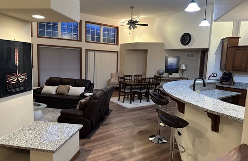 There is a walk in pantry in the kitchen and a laundry room available. Wait a minute are you traveling with kids and need to do laundry more frequently? There is a laundromat 2 mins a way from home. Yes there is also a 65 inch HD TV in the living room. Do you prefer eating at the counter after making that gourmet dish? We have a counter top with adjustable stools in the kitchen or you can opt for the traditional dining table right next to it. We know you probably forgot to buy some supplies/ groceries. There is an Aldi 2 minutes away and Walmart is also a stone throw from the home. Phew did I forget this neighborhood is arguably one of the most serene and beautiful neighborhoods around here don’t be shy to take a walk around and enjoy the pristine streets. While we are working hard to make our home as comfortable as possible, we’re not able to get you some workout equipments yet but we there is an Anytime fitness 3 minutes away from the house.