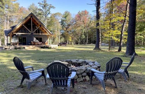 The house is a new construction post and beam chalet with brand-new modern amenities including a chef's kitchen, loft-style second floor, basement rec room with ping pong table, fire pit with Adirondack chairs off the front porch.