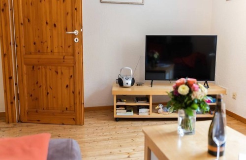 "Entenhaus I", 2-room terraced house 80 m2 on 2 levels on 1st floor. Comfortable furnishings: living room 15 m2 with satellite TV (flat screen), CD-player. Large kitchen 15 m2 (4 hot plates, oven, dishwasher, toaster, kettle, microwave, electric coffee machine) with dining table. Sep. WC. Upper floor: 1 room 15 m2 with 1 double bed (180 cm, length 200 cm). Bath/shower/WC. Balcony 25 m2. Balcony furniture, barbecue (portable), deck chairs (2). Facilities: hair dryer. Internet (WiFi, free). Please note: non-smoking house. Smoke alarm.