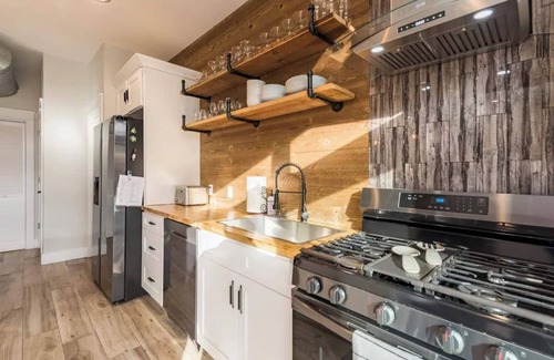 Fully-Equipped kitchen with butcherblock kitchen island for food prep and eating, dishwasher, four-stop stove and oven with hood, two-door fridge and freezer, cabinets, microwave and lots of kitchenware