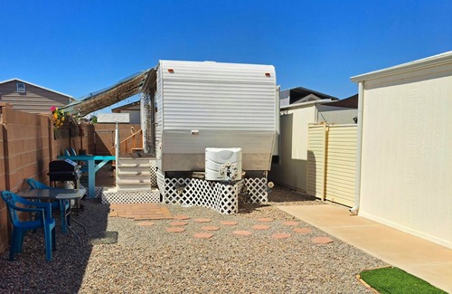 Quiet RV living on a shared and gated lot with your own private driveway and fenced area. This furnished 2 bedroom cozy trailer has 2 slide outs with queen and twin beds.