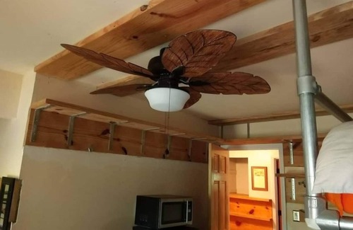 Downstairs bedroom features a king bed, its own kitchenette, a study area, and a full bathroom with a tub. Upstairs bedroom features two queen beds (one lofted), its own fridge and freezer, and overhead storage.