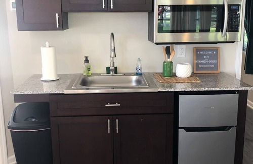 The guest house has one bedroom with a queen bed, a kitchenette with a mini fridge, sink, and microwave, a large sitting area with a sectional sofa and Roku equipped TV, a wall mounted collapsible table/desk, and a bathroom. The sectional sofa can be a great additional sleeping space and is large enough to comfortably sleep two adults. Additional blankets and sheets provided.