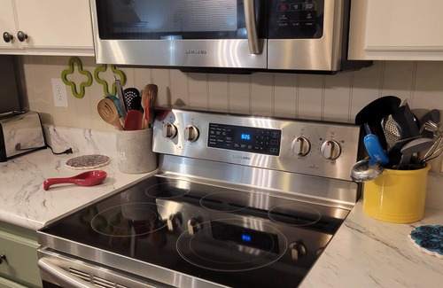 Everything you will need in the kitchen, even a Kitchen Aid Mixer. Plates, Dishes, Glasses, Brew Coffee and Kcup coffee. Utensils, Woks, Frying Pans... you name it. Queen size beds in both rooms, leather reclining couches with USB ports in living room (kids love sleeping on them) and room for an air mattress (we left one there for you) all new appliances, a 50+ inch flat screen TV with Hulu in Living Room and TV in Master and BlueRay Dvd player. Free Wifi throughout, even small office space and extra work from vacation home supplies (printer, keyboard, monitor - PC, not Mac)