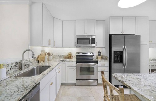 Back inside, a well-appointed kitchen with island and breakfast bar opens seamlessly to your spacious living and dining area, providing an abundance of seating and ample space for you and your guests. After enjoying a day at the beach and the pool, this condo beckons you back in to gather for a large meal together, a family game night, or a cozy movie night on the plush sleeper sofa in front of the wall-mounted 75" smart TV - there's room for it all here! And when it's time to call it a day, this condo very comfortably sleeps five adults so you can recharge for another day of unforgettable memories. (New sectional sleeper sofa coming in July to sleep 7 adults!)