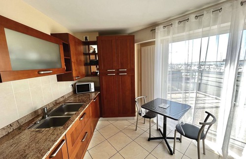 Fitted and equipped kitchen (oven, fridge, freezer, dishwasher, induction hob, microwave, coffee maker, kettle, toaster), with direct access to the terrace and small garden