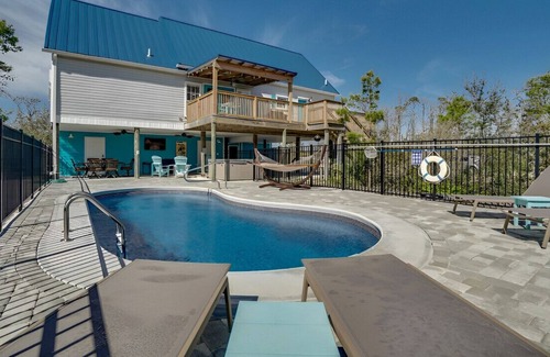 This two-story house provides ample space for everyone, with five bedrooms and four bathrooms. The property has numerous amenities, so you don't have to leave to enjoy your stay. The house features a private pool, hot tub, a 500-foot dock, a screened house by the bay, two fire pits, kayaks, paddle boards, a 3-in-1 gaming table for cards, craps, and dining, and plenty of parking on the large private property.