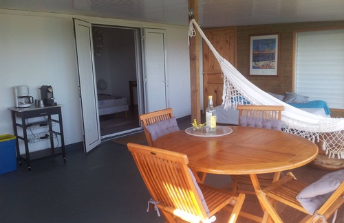 On the heights facing the ilets Pigeon, in low villa exception, very quiet, your cottage awaits you with 1 beautiful air-conditioned room equipped with a bathroom and toilet, TV ... The room opens on a large terrace of 40 m2 with kitchen, dining room, 1 sofa bed and a hammock for the return of beach or diving .. Quiet, birds and sea omni present at 50 m.
