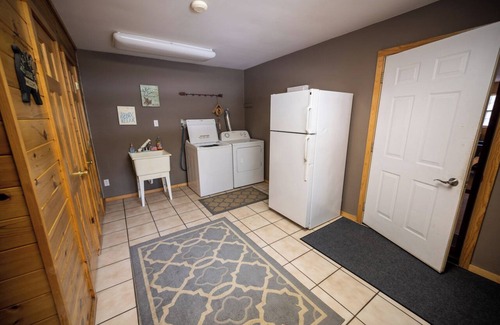 The cabin is perfect for larger families or groups. The cabin features 11 total beds: 1 king, 2 queen, 2 full, and 6 twins. There is 1 bedroom upstairs, 1 bedroom on the main floor, 1 bedroom on the lower level, and another bonus loft (awesome for kids or teens) above the attached garage. There are 3 full bathrooms, 1 on each level.