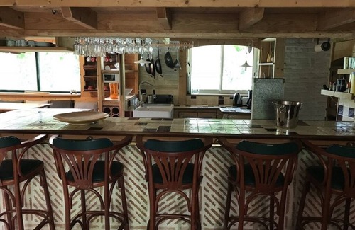 La Morinière - In a magnificent park of 80,000 m2, planted with different Mediterranean species, palm groves, olive groves, fir trees .... in a haven of peace assured, without any person opposite, splendid and unusual property of style "ranch" which can receive 8 people in the house and 4 people in the independent chalet, understanding in the home on the ground floor: entrance hall, spacious living room opening onto outdoor terrace with central wood burning stove, professional kitchen (5-burner gas stove, extractor hood, fridge / freezer), utility room with washing machine, tumble dryer, dining area, dining room , large office, 3 suites of 15 M2 minimum with 2 double beds 140X190 and a double bed of 160X200 each with its bathroom and toilet, dressing rooms, including a suite with sofa. On the floor: a continuation with double bed with room of water and toilet. Panoramic 180 ° view with balcony. Electric gate. Outdoor terrace sheltered with summer kitchen American fridge. Garden Lounge. Walkway connecting the house to the spa and solarium access.