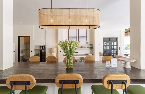 The open-plan living area connects the fully equipped kitchen, dining space, and lounge seamlessly. High ceilings, tasteful décor, and a spacious layout create an airy, relaxing environment that complements the tropical setting.