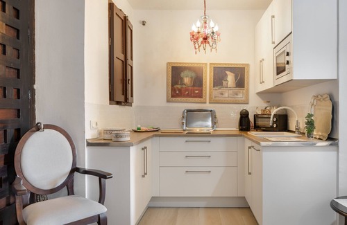 The holiday apartment 'Exclusive Apartment in Palace' is located in El Puerto de Santa María. The 97 m² property consists of a living room, a well-equipped kitchen, 2 bedrooms, and 1 bathroom, accommodating up to 5 people. Additional amenities include high-speed Wi-Fi (suitable for video calls) with a dedicated workspace, smart TV with streaming services, air conditioning, fan, and washing machine. A cot and a high chair are also available. The building has a lift and the accommodation offers a private balcony.