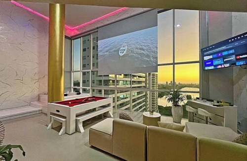 This exclusive duplex offers a one of a kind luxury experience in Cartagena. Just 5 minutes from the airport and close to the historic center, it has a jacuzzi in the room with panoramic view, pool table, Balcony pin pon, and video game machine. In addition, its projector will allow you to enjoy movies on a giant screen. Private balcony, outdoor shower. Every detail is designed to provide you an indulgent and luxurious stay, combining comfort and entertainment in one place.