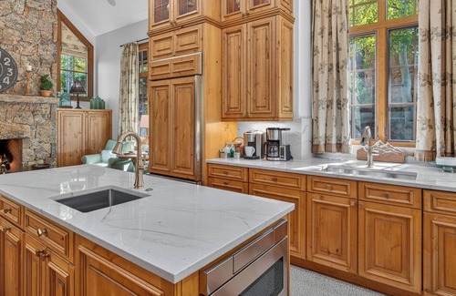 Accommodating up to 14 guests, you’ll experience indoor and outdoor tranquility at Bearberry Lodge. Its outdoor spaces boast a peaceful backyard just above McCoy Creek with an electric fire pit (for summer use only) encircled by Adirondack chairs and great, mature Aspen trees surrounding the area. A hot tub and dining table for 8 make for idyllic days and nights in both summer and winter.